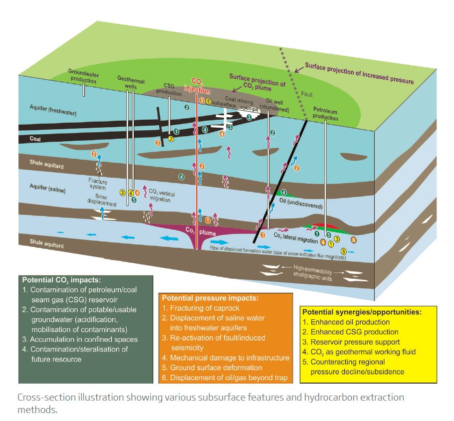 - Adverse interactions – which could include potential contamination by carbon dioxide, resource competition for water disposal reservoirs, brine displacement into adjacent reservoirs and seal compromises.
