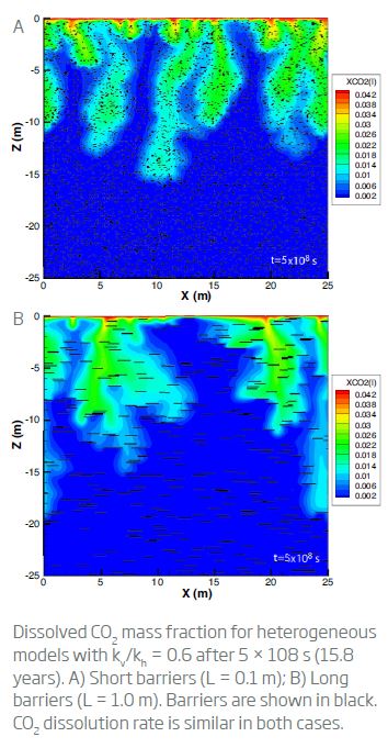 In the long-term, the necessary use of coarse grid blocks in a computational model prohibits the accurate simulation of enhanced dissolution due to density-driven convective mixing. This type of mixing typically occurs at a spatial length scale that is smaller than the size of the grid blocks necessary in a field-scale simulation. In order to improve the long-term numerical predictions of CO2 dissolution in models that feature large grid blocks, a better understanding of the convective mixing process in heterogeneous reservoirs and the role of geochemical reactions is required.