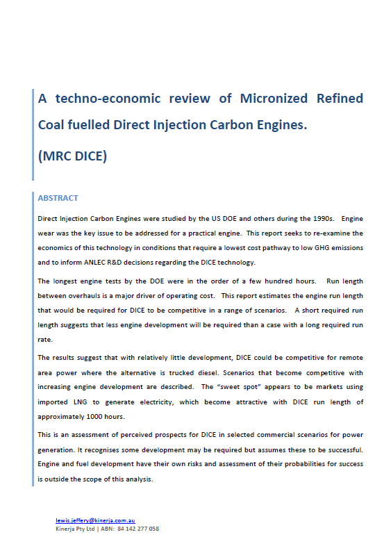 Diesel engines have run on coal in the past. High thermal efficiencies and fast response times reportedly make this a potentially useful route to low emissions power generation, if the engine wear issues are resolved. This study was commissioned to gain understanding of the techno-economic prospects for developing such a technology. Micronised Refined Coal (MRC) fuel for DICE engines was successfully made from a range of black coals, and from brown coal.