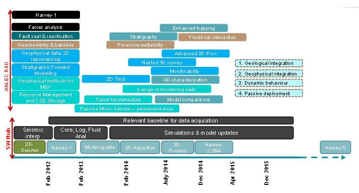 To date, the ANLEC R&D science program for the SW Hub has included 14 projects examining various aspects of the carbon storage based on the available 2D seismic acquisition and well bore data from Harvey-1.